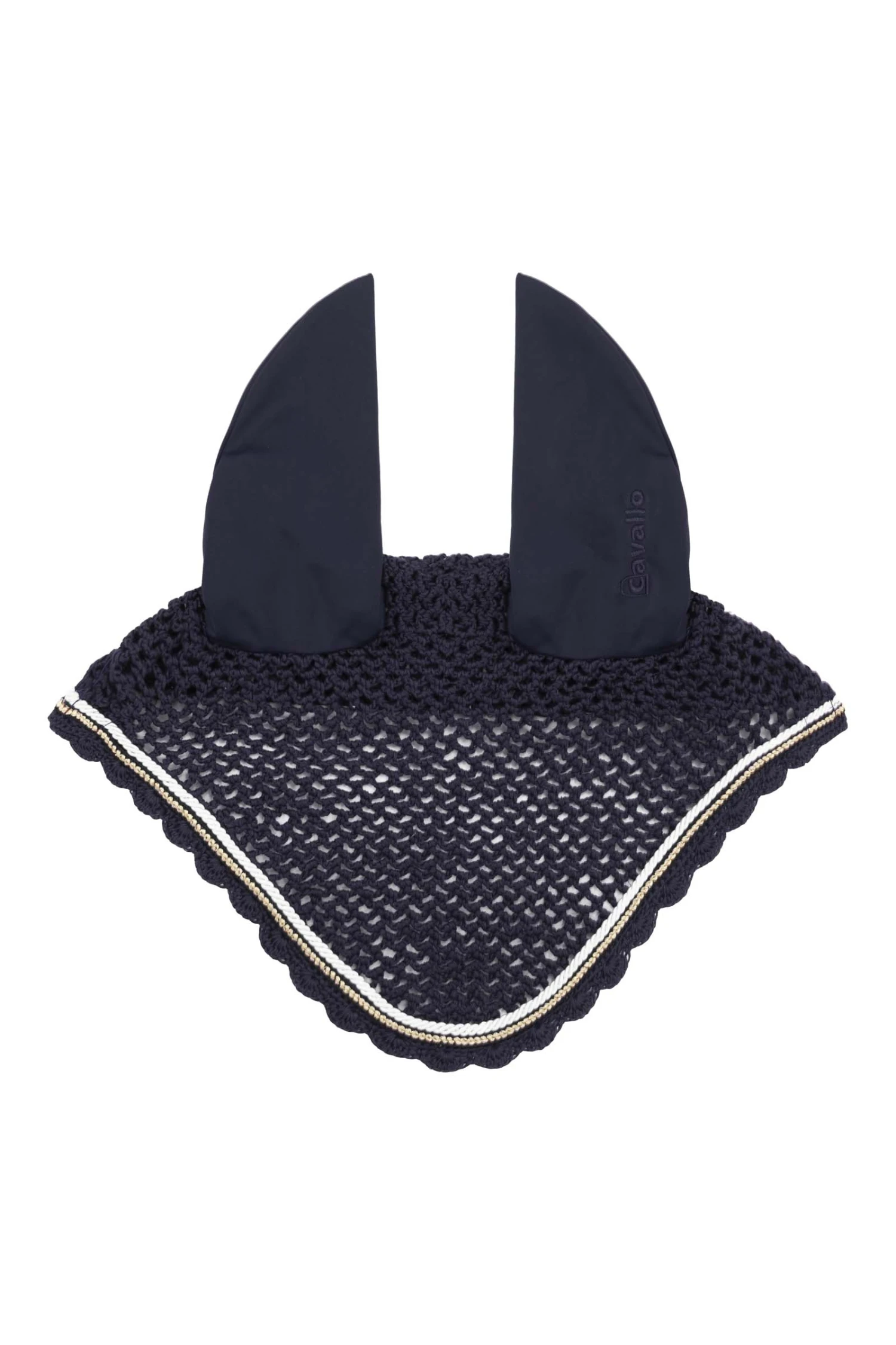 Fliegenohren aus schnelltrocknendem, hautfreundlichem Funktionsjersey im Ohrenbereich. Das linke Ohr ist mit dem Cavallo Schriftzug bestickt. Kopfbereich in Häkeloptik. Einfassung durch formbeständige Kordel in Weiß und einem schwarzen Band mit goldenen, schimmernden Fäden.