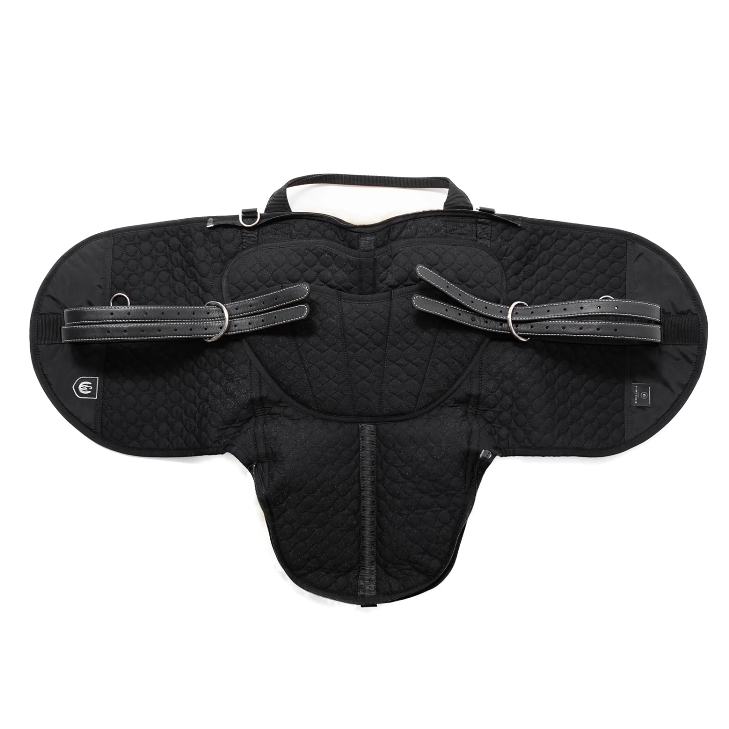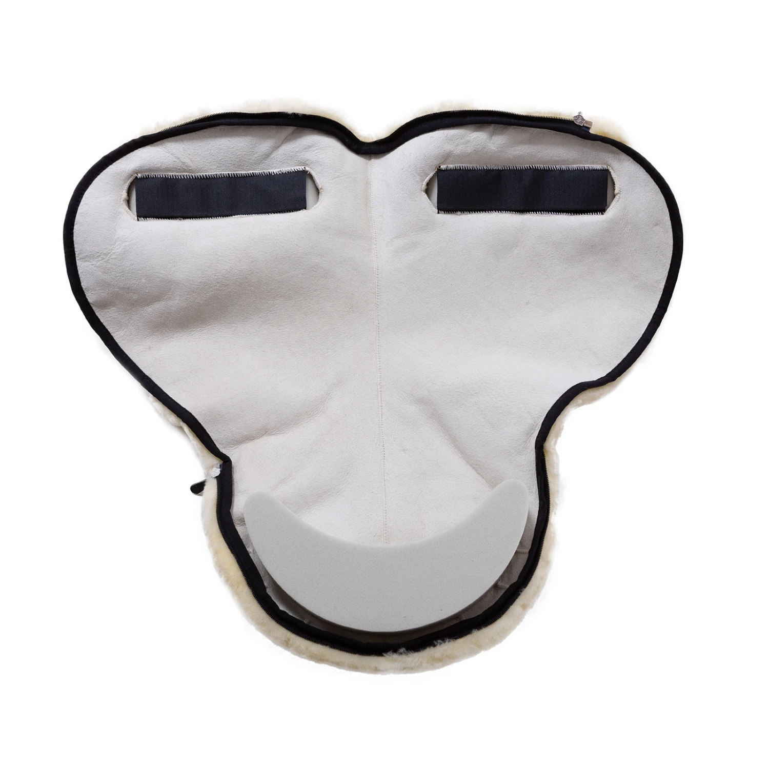 Die Sitzfläche ist komplett aus Lammfell mit einer Wollhöhe von ca. 20mm gefertigt, die Unterseite nur im Rückenbereich. Seitliche Fellpauschen bieten zusätzlichen Halt. Unter dem durch einen Reißverschluß abnehmbaren Sitzfell besteht die Möglichkeit ein spezielles Kopfeisen in eine Tasche einzuschieben. Die am Kopfeisen befestigten Sturzfedern erlauben das Aufsteigen über Steigbügel. Herausnehmbare Polster links und rechts vom Wirbelkanal erhöhen den Sitzkomfort und schonen den Pferderücken. Warmblut- und Ponygrößen werden unter der Artikelnummer 14483 verkauft.