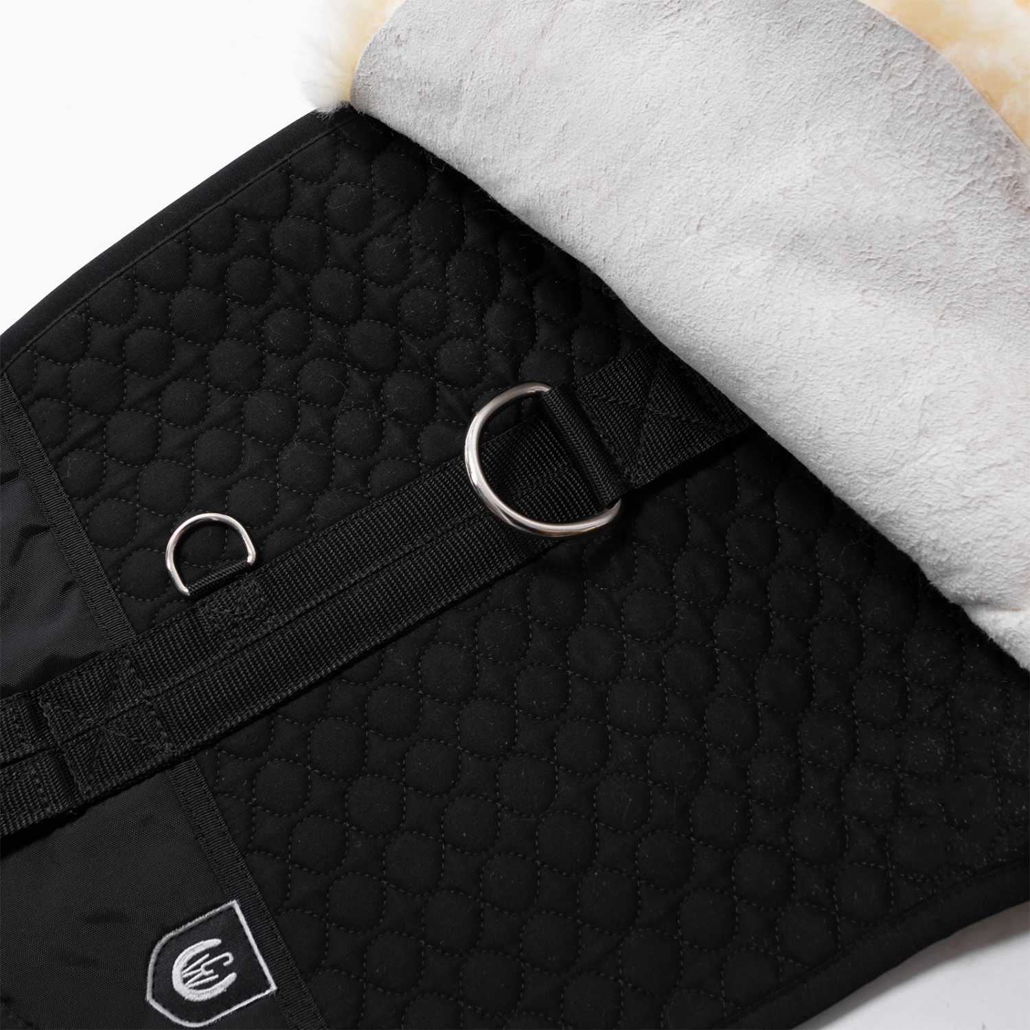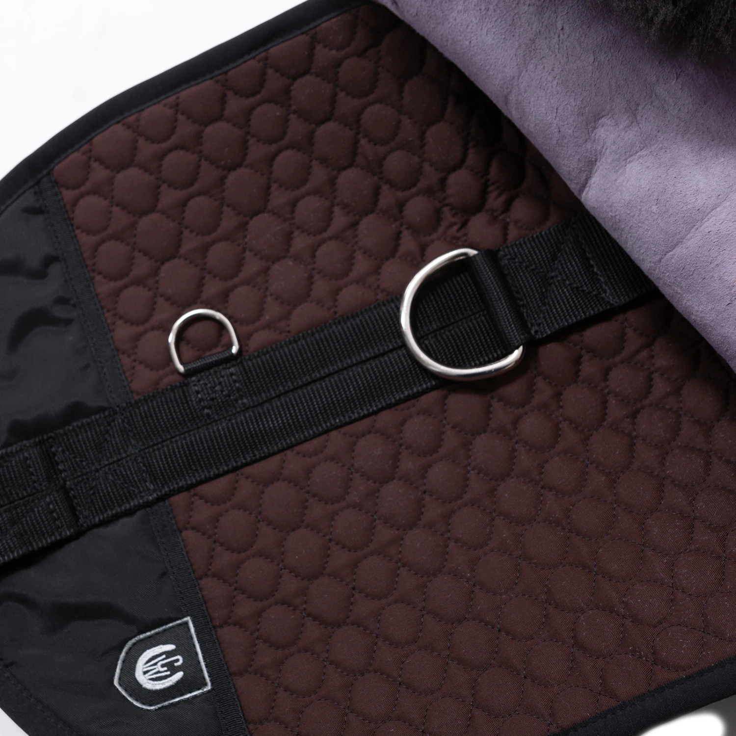Die Sitzfläche ist komplett aus Lammfell mit einer Wollhöhe von ca. 30mm gefertigt, die Unterseite nur im Rückenbereich. In der Sattellage sind beidseitig vom Wirbelkanal herausnehmbare Verbundschaumpolster eingearbeitet. Das erhöht zum einen den Sitzkomfort für den Reiter und zum anderen den Rückenschutz fürs Pferd. Zur besseren Balance besteht die Möglichkeit, Steigbügelriemen in D-Ringe unter dem Sitzfell zu befestigen. Maschinenwaschbar mit einem Lammfellwaschmittel sowie trocknerbeständig. Als Waschmittel empfehlen wir das Produkt „C7“. Bitte beachte die Pflegehinweise.