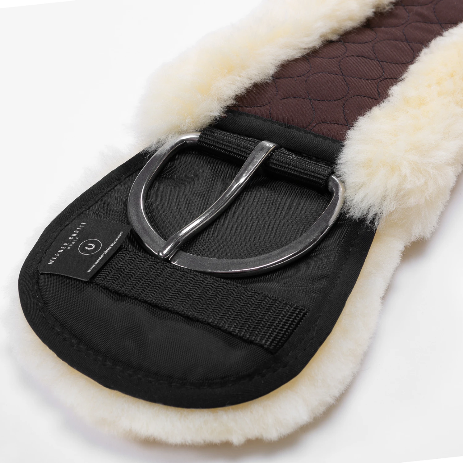 Anatomischer Westerngurt mit konkaver Sichelform. Die innere, kürzere Seite gehört nach vorne, in Richtung der Vorderbeine. Die längere, konvexe Außenseite zeigt zum Bauch hin. Damit öffnet sich der Gurt nach hinten etwas und wird nicht mehr so stark nach vorne gezogen. Er beitet eine sehr gute Ellbogenfreiheit. Die Schnallen und D-Ringe sind aus Edelstahl. Die Wollhöhe beträgt ca. 30 mm.
