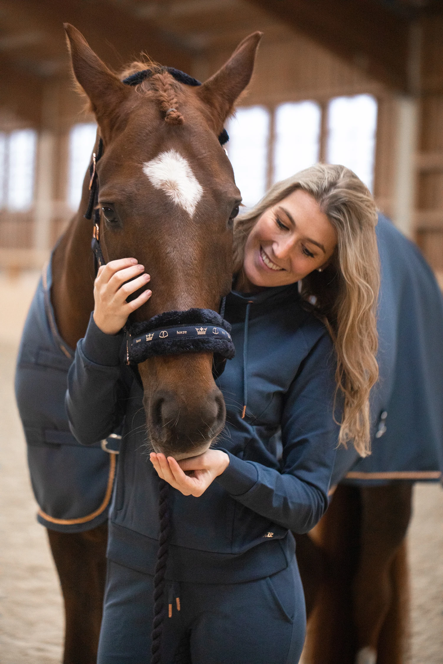Die Glarus Fleecedecke ist aus weichem Material mit einer gebürsteten Innenseite gefertigt. Doppeltes Fleece am Widerrist sorgt für zusätzlichen Komfort. Zwei Schnallen vorne, Kreuzgurte und eine Schweifriemen halten die Decke an ihrem Platz. Geflochtene roségoldene Paspeln verlaufen rund um die Decke und bringen ein wenig Glanz in dein Sattelzeug. Kombiniere sie mit unserem Horze Glarus Kunstfellhalfter und der Führstrick für einen kompletten Look!