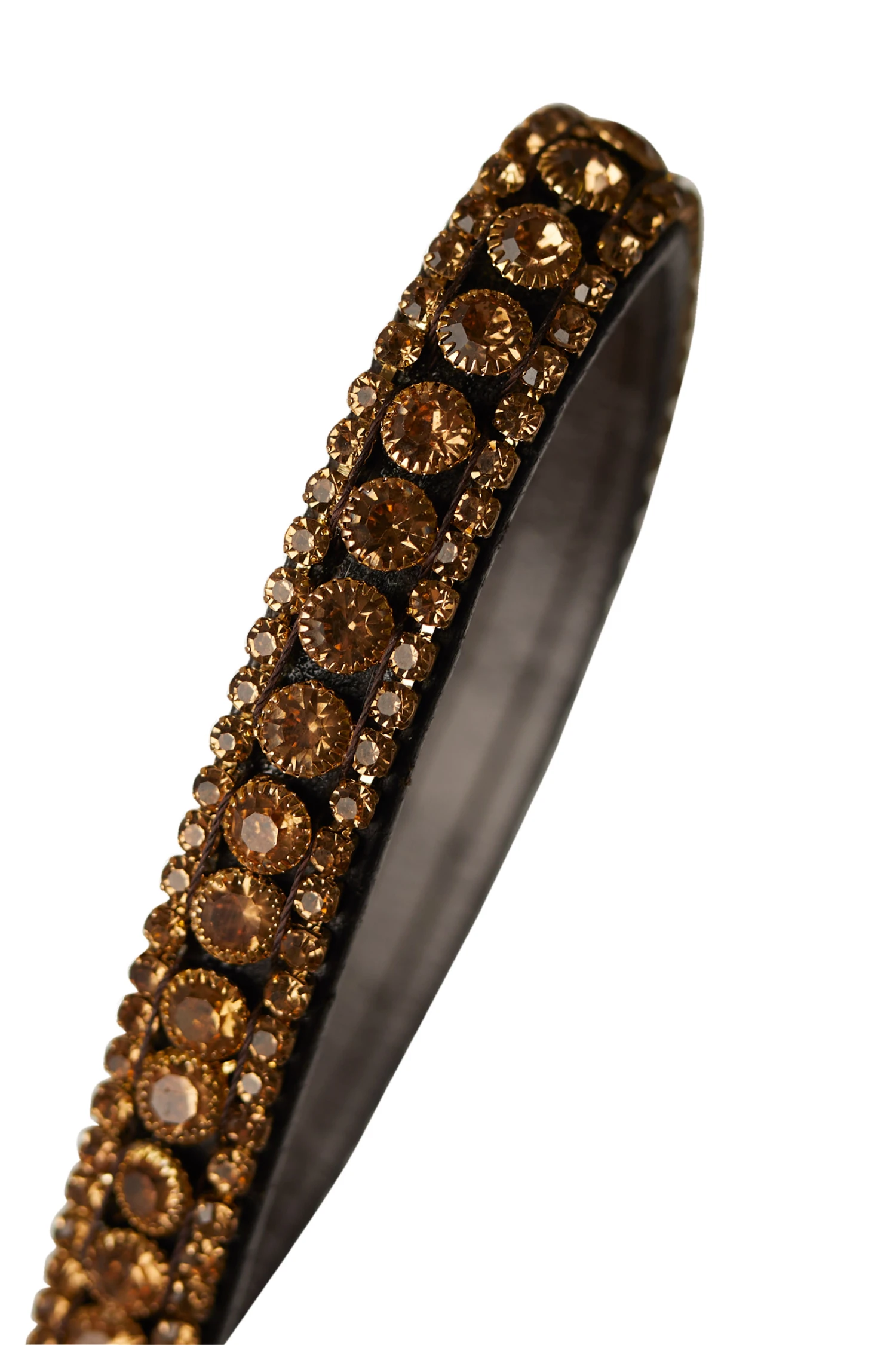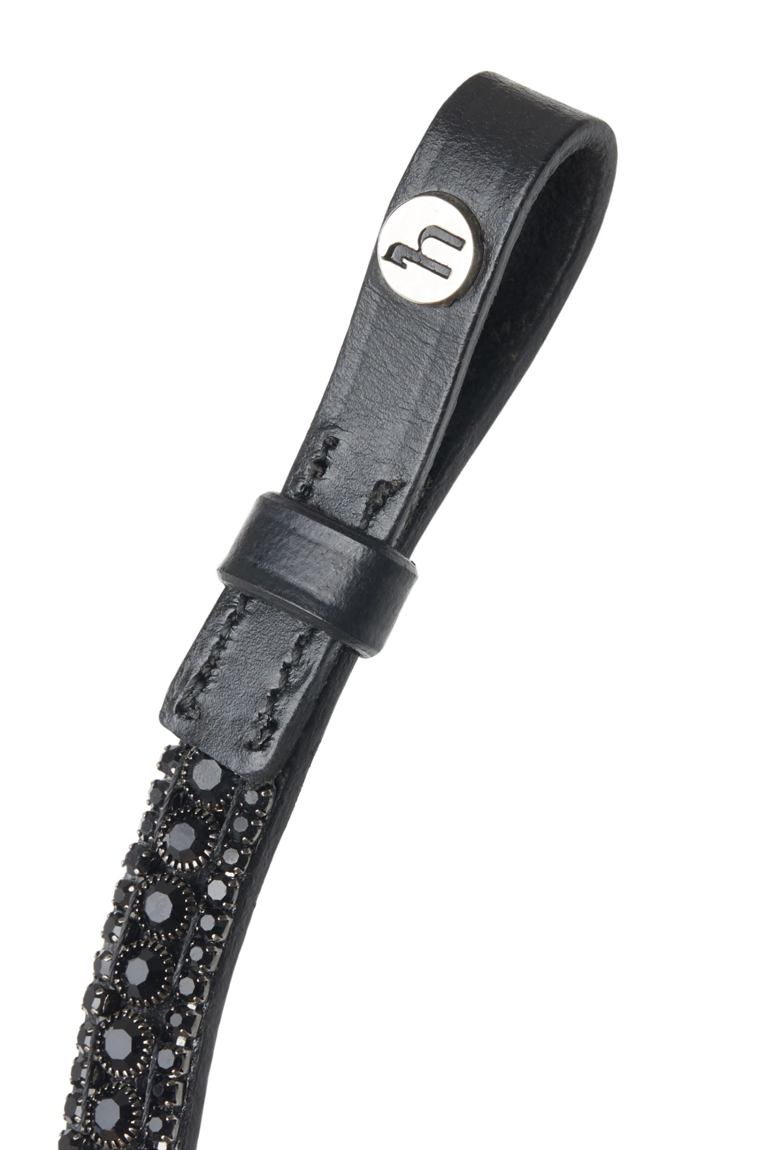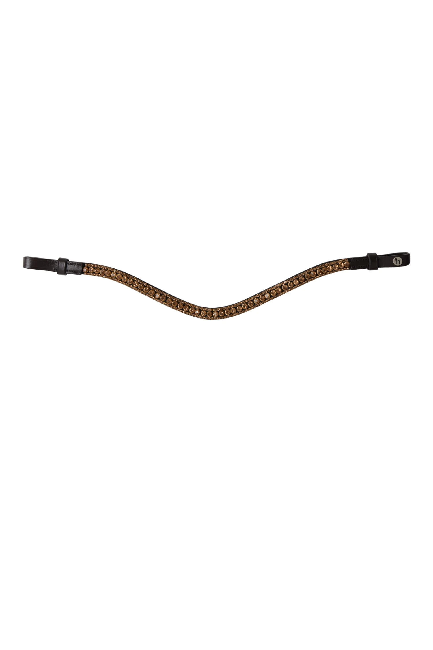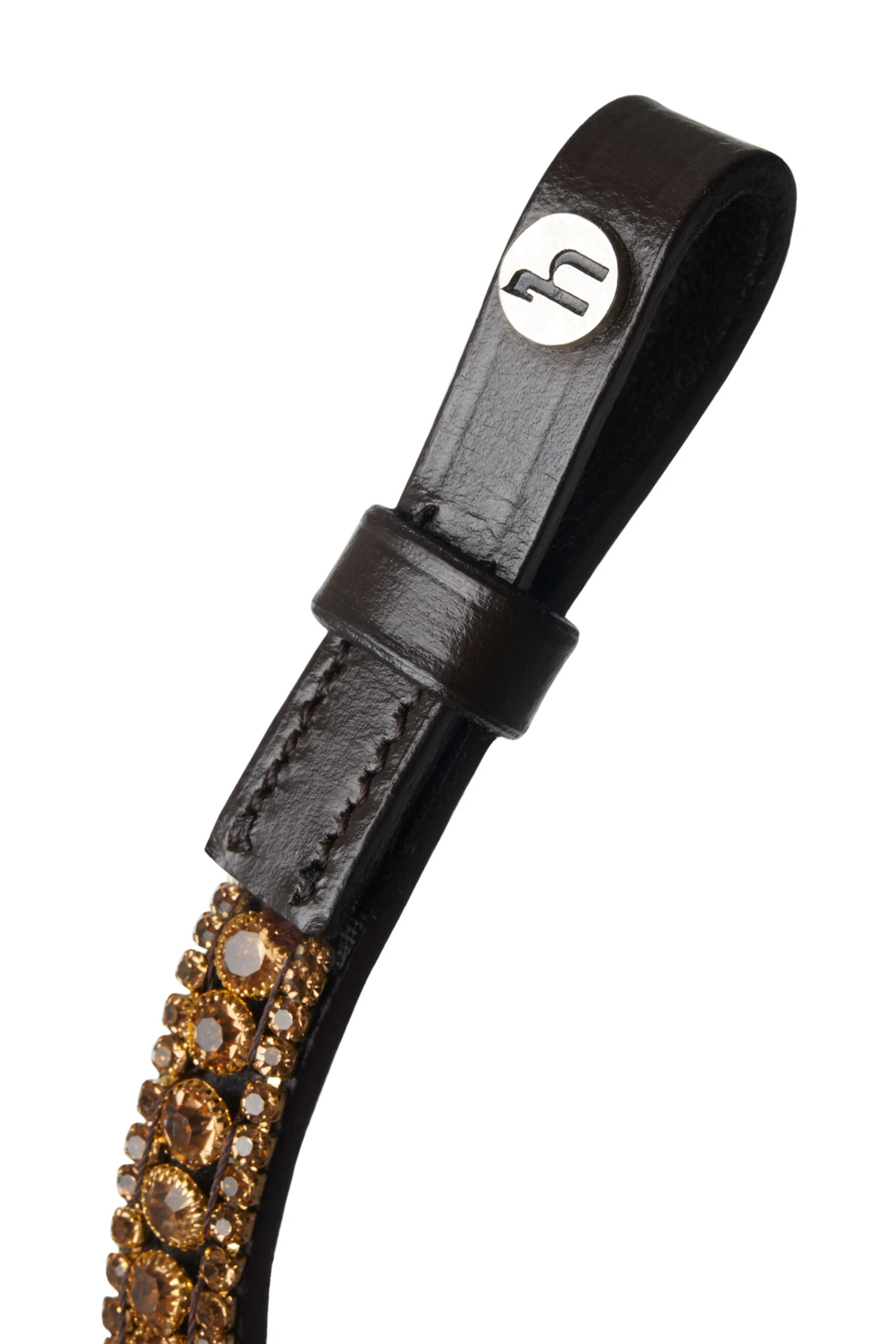 Geschwungener Stirnriemen mit drei Reihen von Kristallen Ton in Ton mit dem Leder des Stirnriemens. Die Schnellwechselenden mit Klettverschluss machen es einfach, die Stirnriemen auszutauschen, auch wenn die Trense bereits am Pferd ist.
