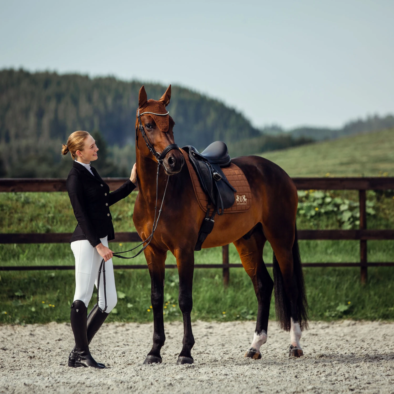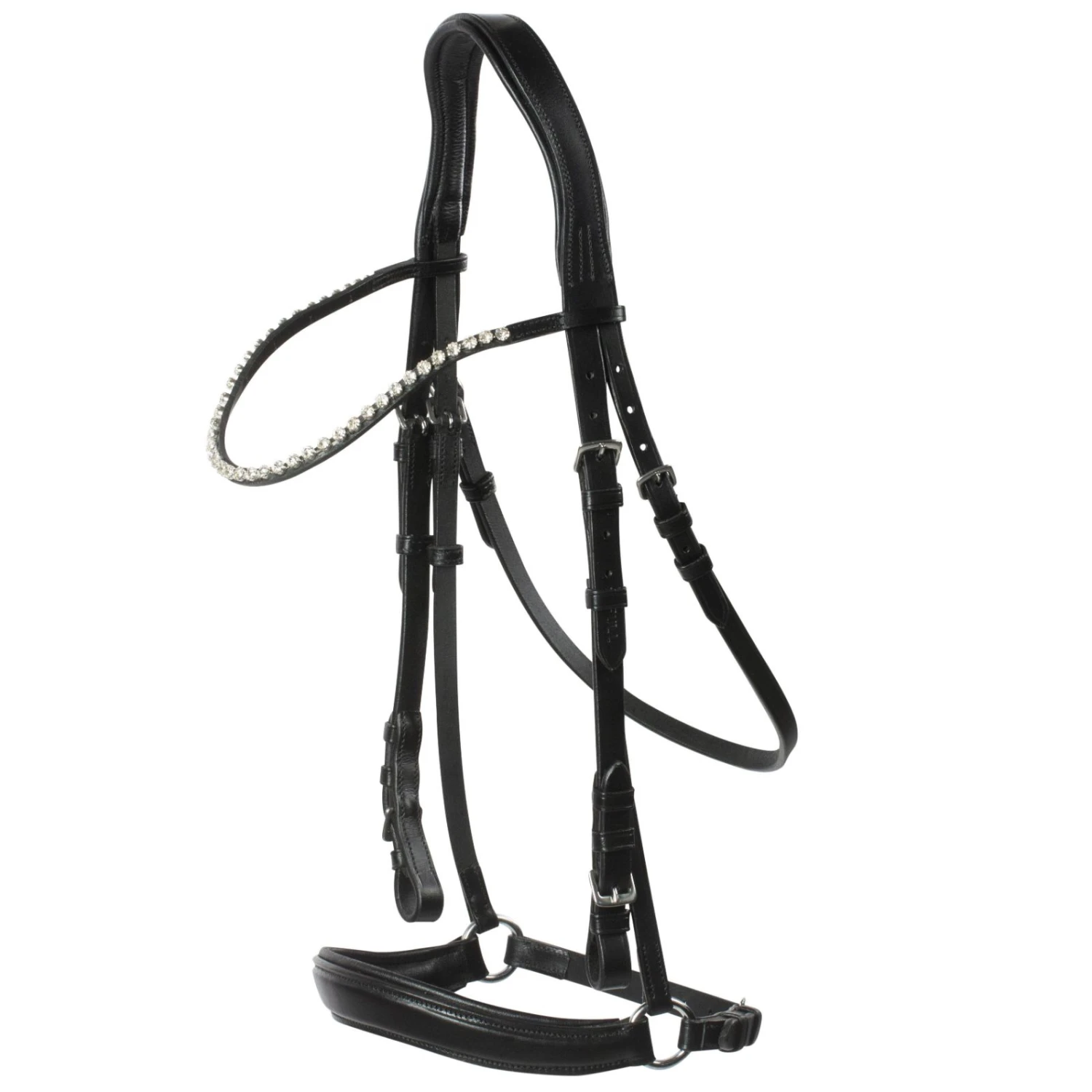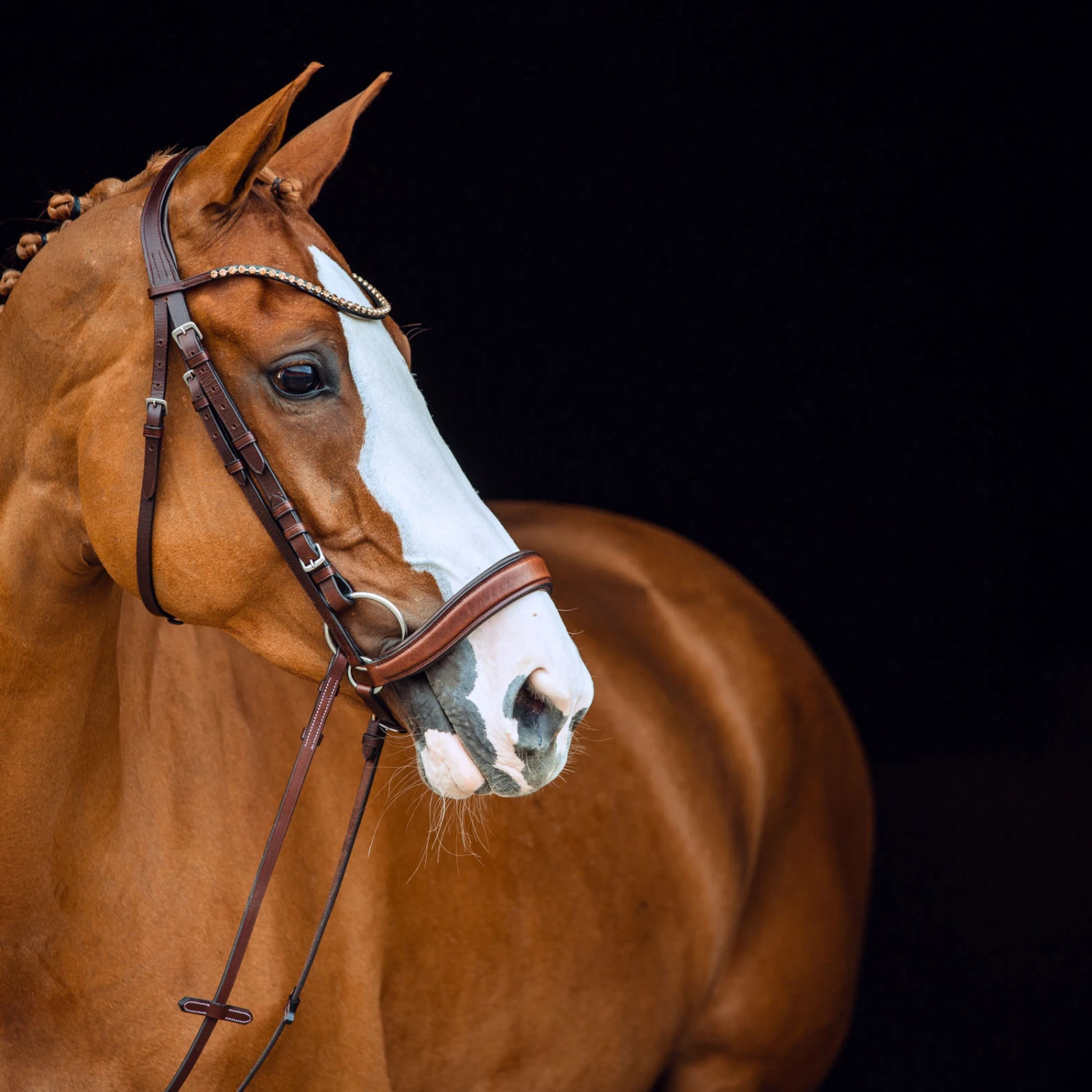 Diese anatomisch geformte Trense ist mit breitem Nasenriemen und gebogenem Nackenriemen ausgetattet, die sich dem Pferdekopf perfekt anpassen. Die super weiche Polsterung an Nase und Genick machen die Trense noch bequemer und verhindern unangenehme Reibung. Ein schmaler gebogener Stirnriemen mit glänzenden Kristallen bringt einen Hauch Eleganz.