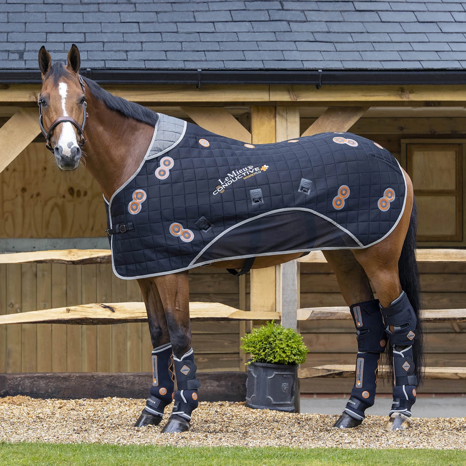 Die LeMieux Conductive Magno Rug läutet einen neuen Ansatz in der Magnettherapie ein. Einzigartige Innenschichten enthalten eine gewebte Schicht aus Stahlfasern direkt unter leistungsstarken 2600-Gauss-Doppelmagneten, die an Schlüsselstellen über Schulter, Ellenbogen, Hüfte, Kniegelenk, Oberschenkel und an beiden Seiten der Wirbelsäule platziert sind. Die Stahlfäden leiten die magnetischen Wellen gleichmäßig um das Futter herum und bringen so den gesamten Oberkörper in das Magnetfeld. Die atmungsaktive Oberseite aus 3D Mesh leitet die von den Magneten aufgestaute Wärme ab. Mit den 3-fach verstellbaren Bauchgurten kannst du die Decke gut an dein Pferd anpassen und so die optimale Magnetwirkung erzielen.