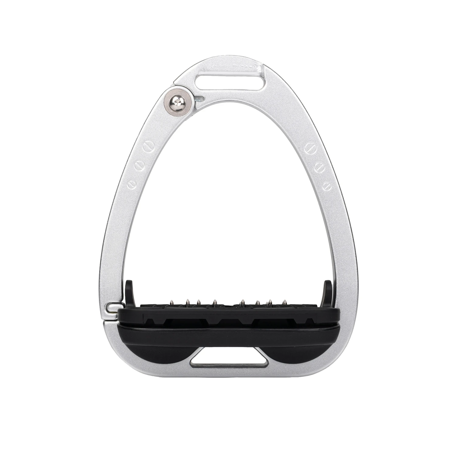 Die Trittfläche wird durch ein Twin-Balance-Bogensystem gestützt, das das Gewicht gleichmäßig auf die Basis des Steigbügelrahmens verteilt. Der Scheitelpunkt des Rahmens ist vertieft und versetzt, was eine 45º-Ausrichtung nach außen fördert und es dem Reiter erleichtert, den optimalen Winkel für den Fuß zu finden und einen verlorenen Steigbügel wiederzufinden.