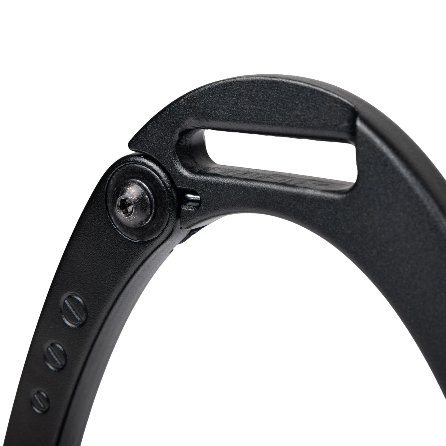 Ein integrierter Sicherheitsarm verfügt über ein zweistufiges Auslösesystem, das ein ungewolltes Öffnen verhindert. Der federbelastete Sicherheitsarm rastet in der Basis des Hauptrahmens ein, so dass bei hoher Belastung beispielsweise nach einem Sprung das Gewicht des Reiters gleichmäßig auf den Steigbügel verteilt wird. Wenn Druck auf den Steigbügelarm ausgeübt wird, z. B. bei einem Sturz, löst sich der Arm, so dass sich der Fuß nicht im Steigbügel verfangen kann. Die Auslösekraft des Steigbügelarms beträgt im Test 36N (entspricht 3,62kg), d.h. genug Widerstand, um ein versehentliches Öffnen zu verhindern, aber ein sicheres Auslösen im Falle eines Sturzes des Reiters zu gewährleisten.